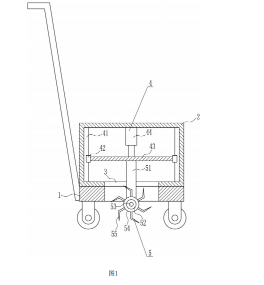 农业种植是在土地上种植农作物,在种植前需对土地泥土进行破碎,目前的破碎 设备体积较大,不方便移动,人工破碎效率低、费时费力,因此亟需研发一种体积小方便 移 动、破碎效率高、省时省力的农业用土壤破碎设备。 一种农业用土壤破碎设备。本发明要解决的技术问题是提供一种体积小方便移动、破碎效率高、省时省力的农业用土地泥土破碎设备。为了解决上述技术问题,本发明提供了这样一种农业用土地泥土破碎设备,包括有推车等;推车的车板顶部安装有箱体,箱体的底部和推车的车板中部均开有开口,箱体内设有升降装置,升降装置的升降部件上设有第一破碎装置,第一破碎装置穿过开口。本发明通过第一破碎装置和第二破碎装置对土地泥土进行高效破碎,刮平装置将破碎后的土地泥土进行刮平,从而提高破碎效果,达到了体积小方便移动、破碎效率高、省时省力的效果。