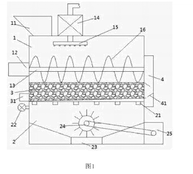 图中卜清洗腔,11-进料口,12-第一电机,13-绞龙轴,14-水泵,15-喷淋管,16-绞龙叶片,2-干燥腔,21-微波加热器,22-排风机,23-出料口,24-翻转辊,25-第二电机,3-溢流层,31-排水口,4-连接箱,41-导向板。
